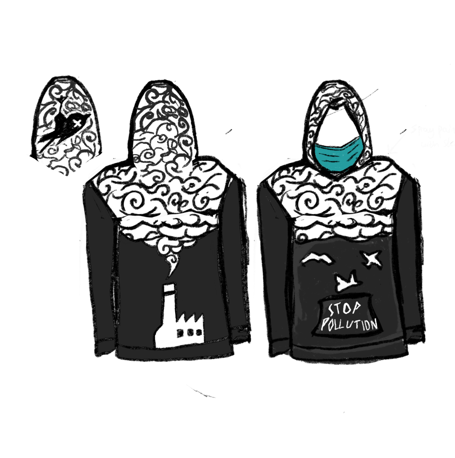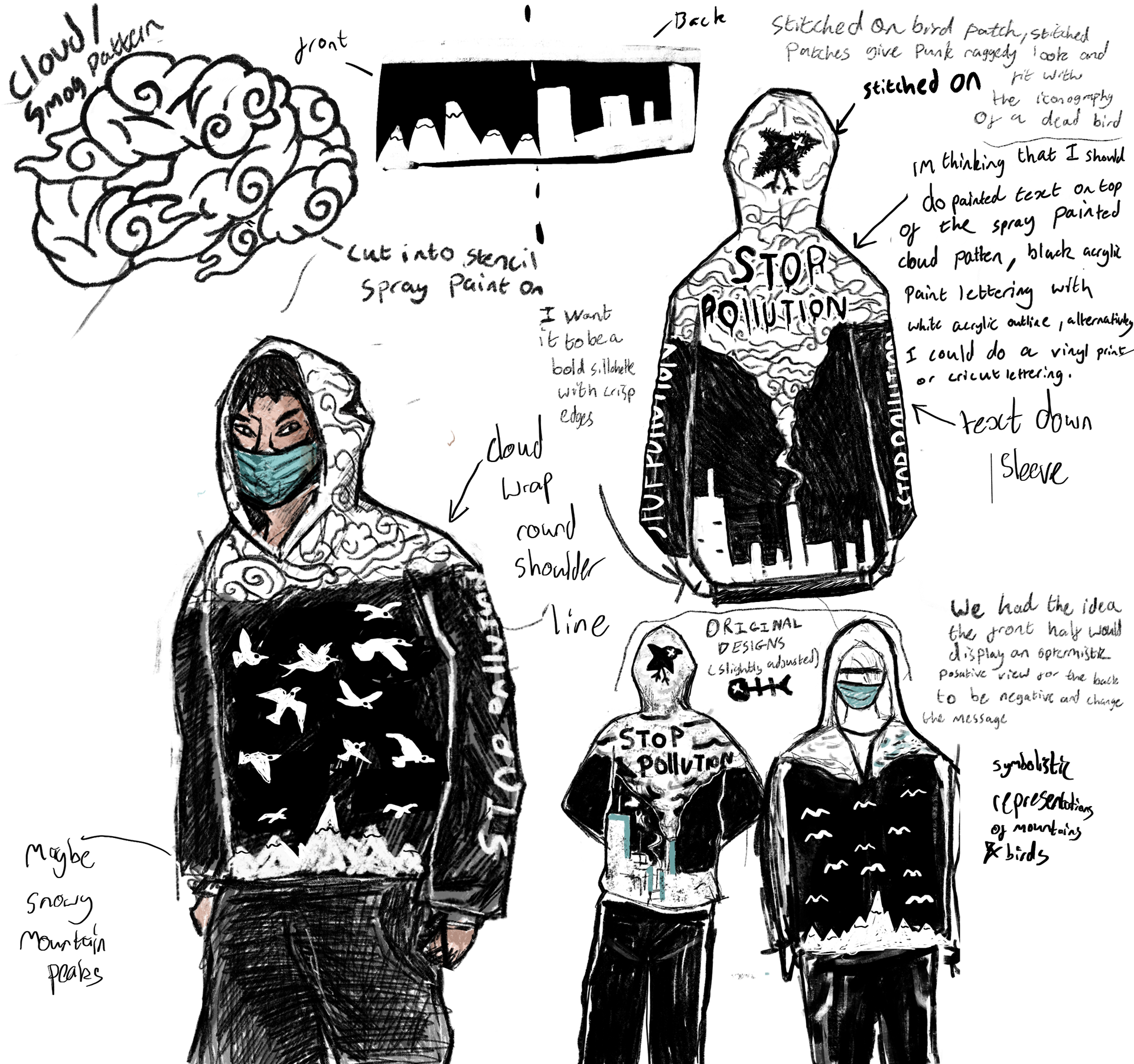 This Garment was created in response to a group fashion project called ‘BOLD’ in which we ‘designed for change’ my garment uses fashion design to protest pollution. The garment was created using recycled clothing which then had stencils applied spray painting on the decorative cloud design, the birds, text and factory were then painted on with acrylics.