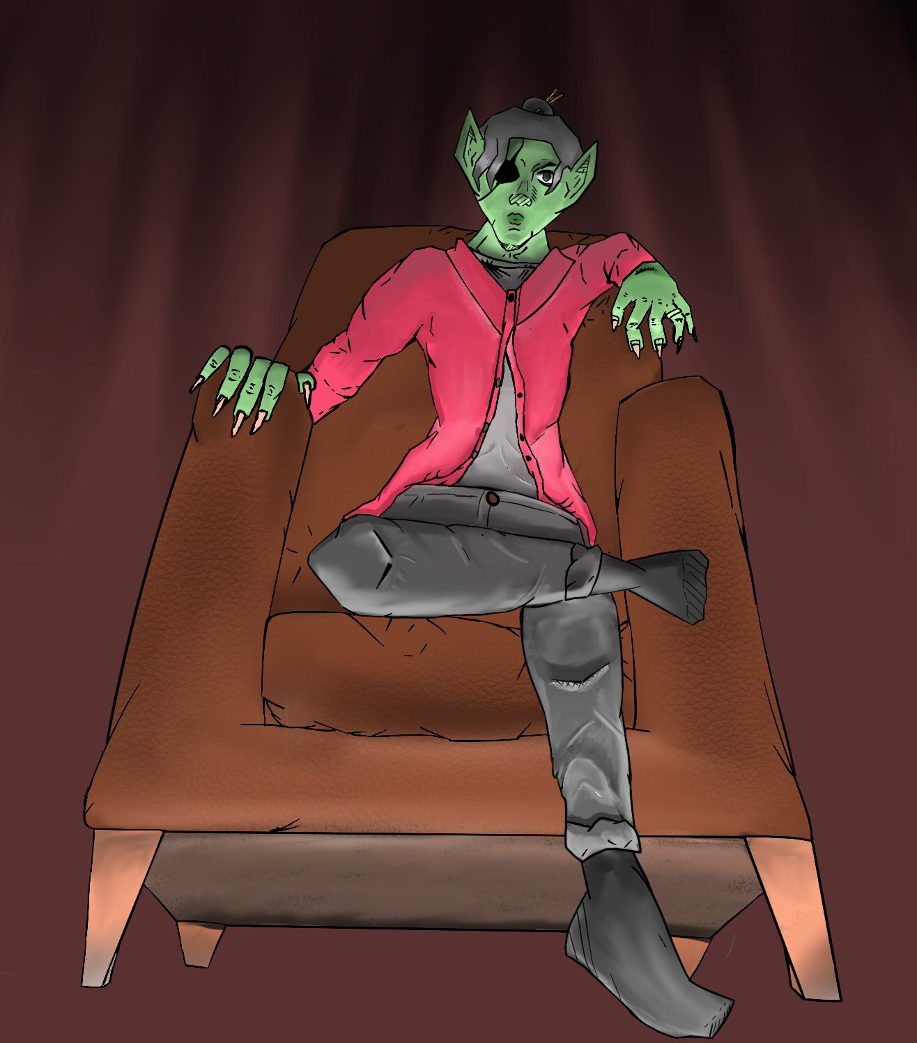 Digital illustration Study I made of my original goblin character. I focused on developing my abilities with dramatic perspective in poses as well as stylisation in the character with the line art.