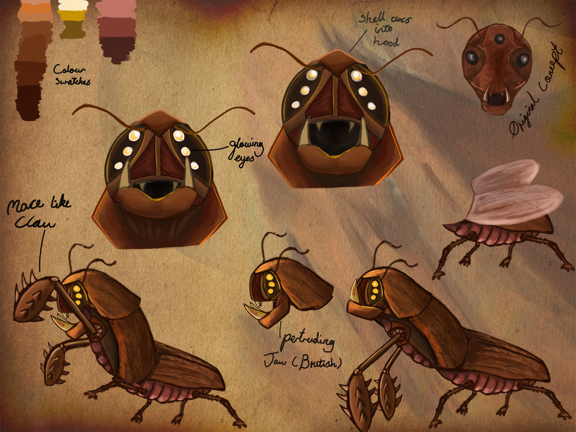 Roach creature concept sheet I made in the planning and development of my NEW WORLD project, digitally illustrated in Procreate.